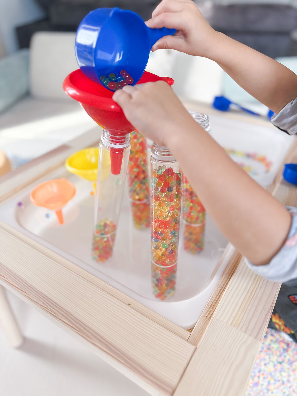 Kinder erkunden Farben, Formen, Muster, Mengen, Materialien und Bewegungen. Sie trainieren Feinmotorik, Konzentration, Ausdauer und Wahrnehmung – während sie einfach spielen.